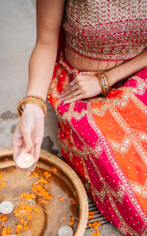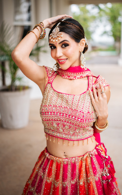 A bright pink and orange lehenga with heavy embroidery and a matching dupatta. A bold choice for weddings, haldi-mehndi ceremonies, or festive nights.