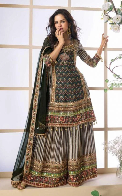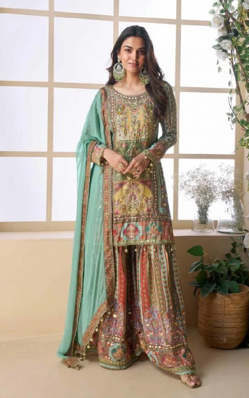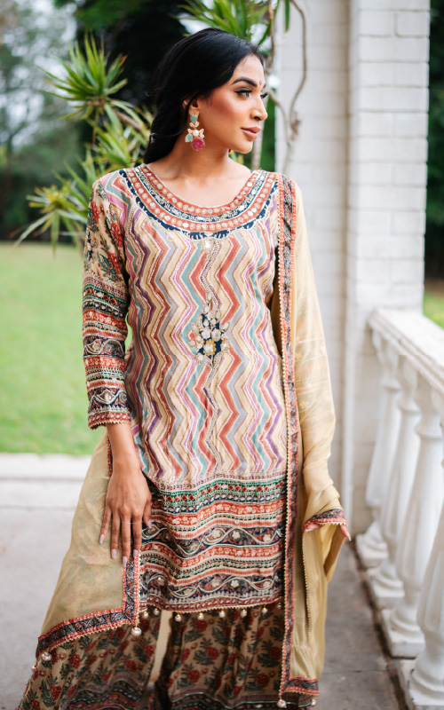 A mosaic-toned sharara set with heritage embroidery and floral detailing. A striking piece for traditional gatherings.